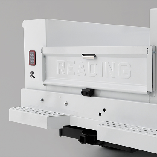 The iconic Reading tailgate is easy to open and shut with a pickup-style latch and slam-action closure, and includes a Stainless Steel polished handle on Classic II. Tailgate is 14″ tall with a treadplate working surface, to provide sure-footed access to the loadspace. The latching hardware is stainless steel — knee braces, locking rods, hinge rods and striker channels. Knee braces are removable and protect against rust and corrosion while allowing the tailgate to swing down completely.