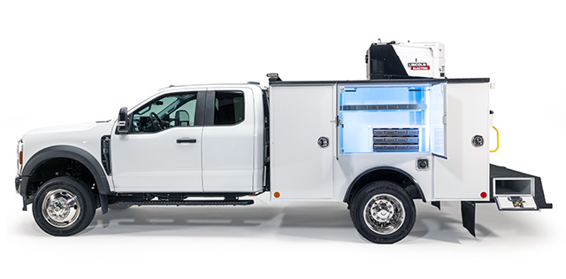 Our RHD Service Bodies are designed to accept floodlights to increase your work-area visibility. Ultrabright LED 2,400-lumen lamps are adjustable to where you need them and keep you working safely after dark.